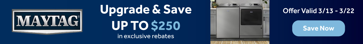 Receive up to a $250 rebate with purchase of qualifying Whirlpool or Maytag Laundry Appliances. Rebate form must be postmarked by 4/22/2026.